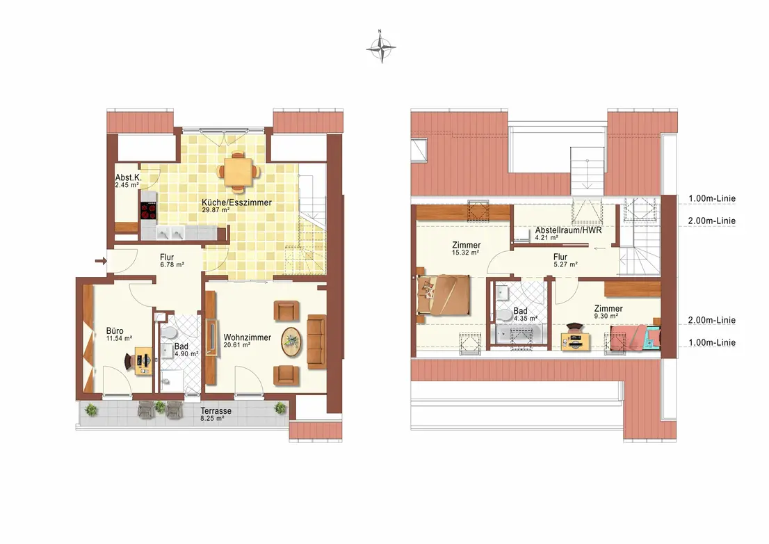 - 2 Bäder (Badewanne, bodenebene Dusche)